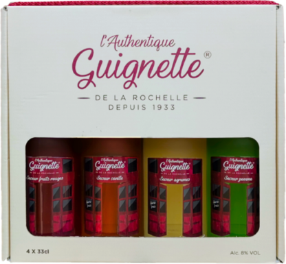 Le coffret de 4 bouteilles vous permet de découvrir tous les univers de Guignette. Qu’il s’agisse de la gourmandise de Guignette Fruits rouges, la richesse de Guignette vanille, l’acidité de Guignette Agrumes ou le parfum de Guignette Pomme. Ce choix d’apéritifs offrent de nouvelles occasions de partage et vous invitent à vivre des instants de convivialité qui sont le quotidien du comptoir de la Guignette, le fameux bistrot rochelais. Cet assortiment de couleurs rouge, ambrée, jaune et verte constitue l’arc-en-ciel des saveurs uniques de Guignette et vous convie à un dégustation originale.